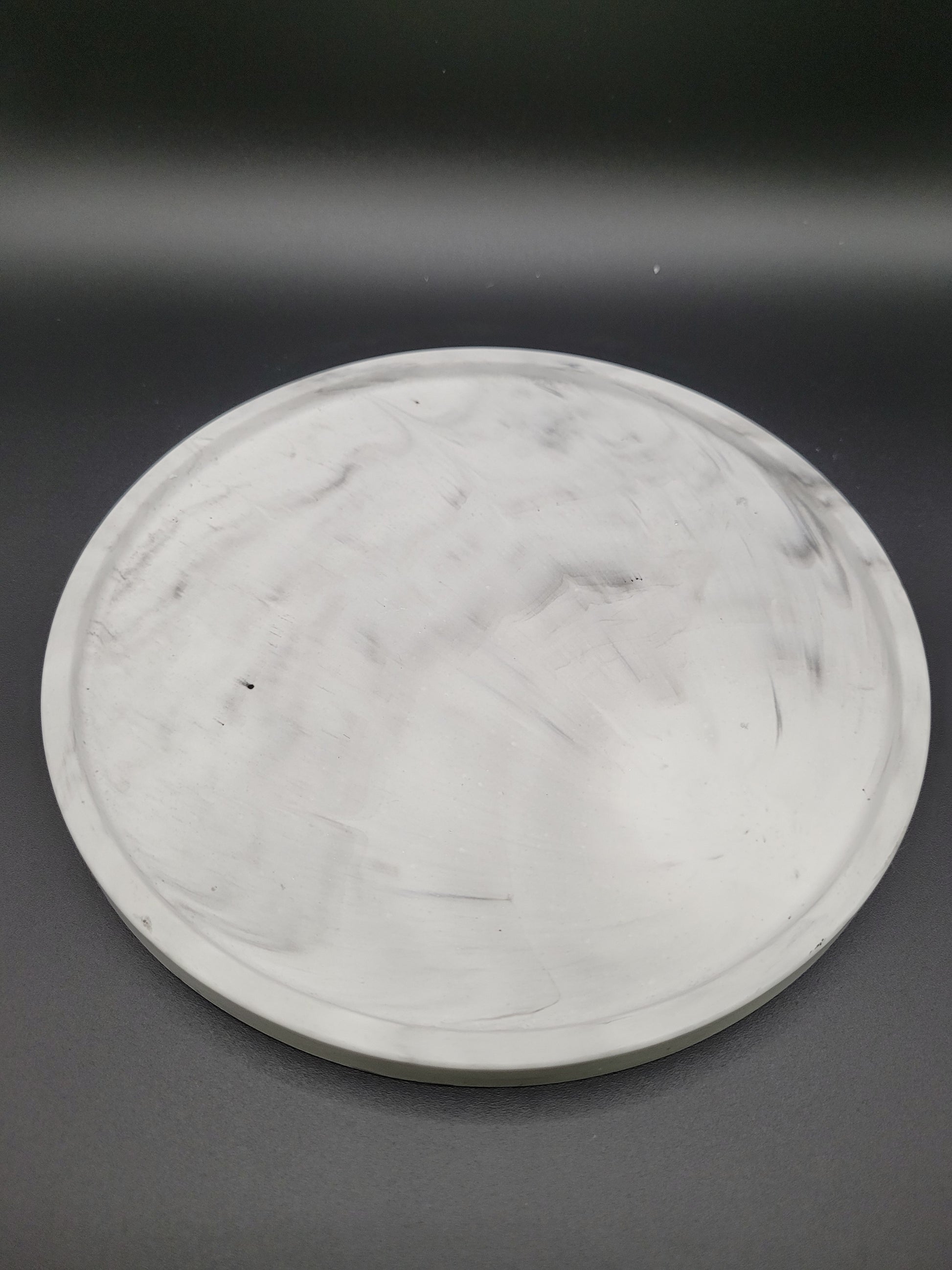 Add a touch of handcrafted charm to your home decor with our Round Tray. Each tray is unique, hand made from Jesmonite for a beautiful finish. Perfect for displaying jewelry or candles, this small tray measures 16 x 16 x 1.25 cm. (Jewelry and candle not included.)"